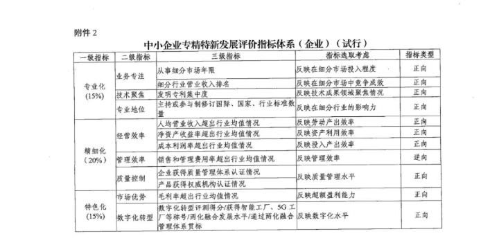 工業(yè)和信息化部辦公廳關(guān)于印發(fā)《中小企業(yè)專精特新發(fā)展評(píng)價(jià)指標(biāo)體系(試行)》的通知